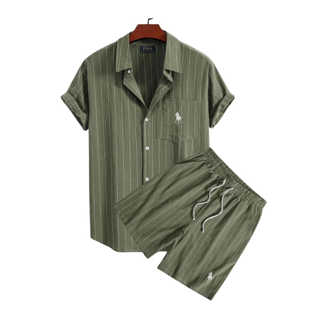 Cada Conjunto incluye una camisa de rayas de manga corta y un kurzer Ligero A Juego, Ambos Con El Icónico Bordado del Jinete R & l.